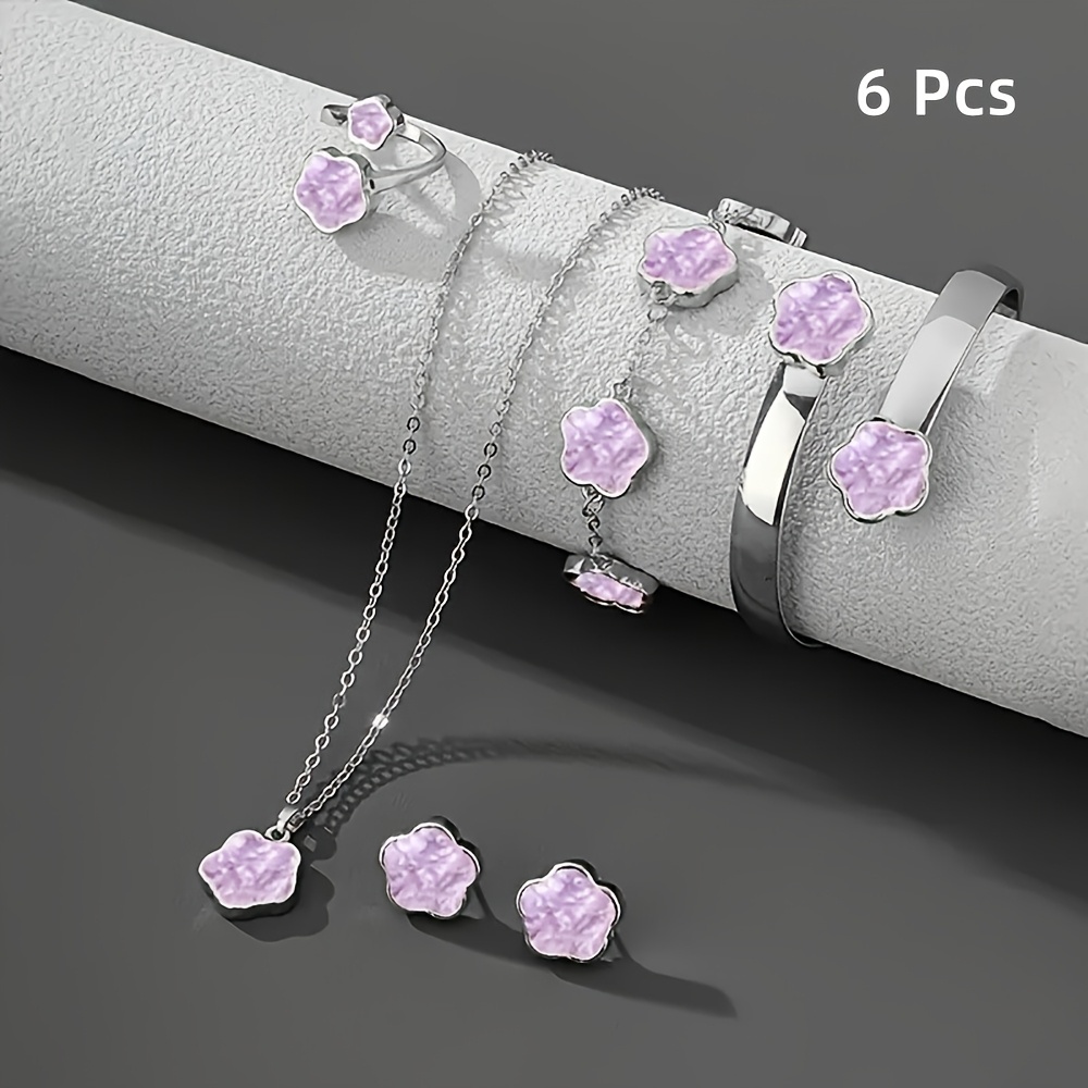 6pcs Lucky Flower 6pcs Jewelry Set: Pendant, Ring, Bracelet, Earrings & Floral Pieces blooming design symbolizes luck, versatile for all occasions, elegant and charming, ideal for gifting or self-adornment. Five Leaf Clover Five Leaf Petal Design